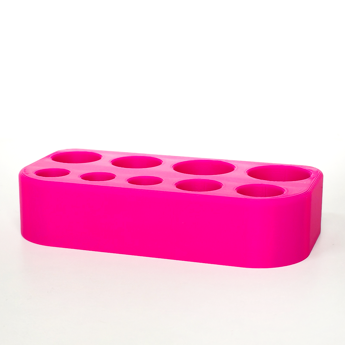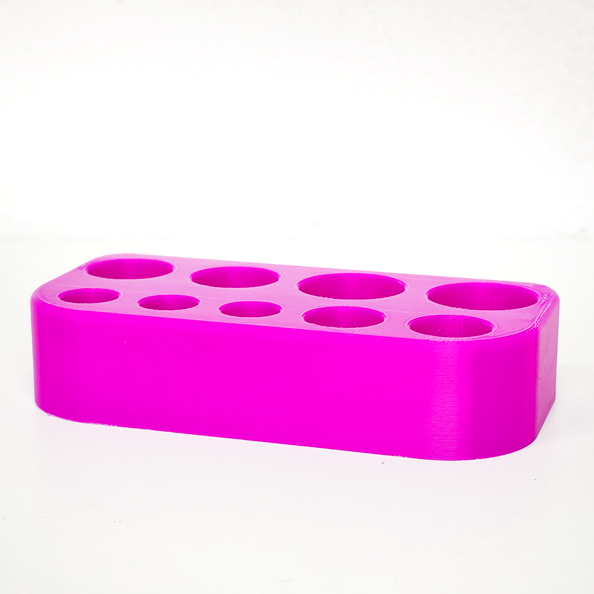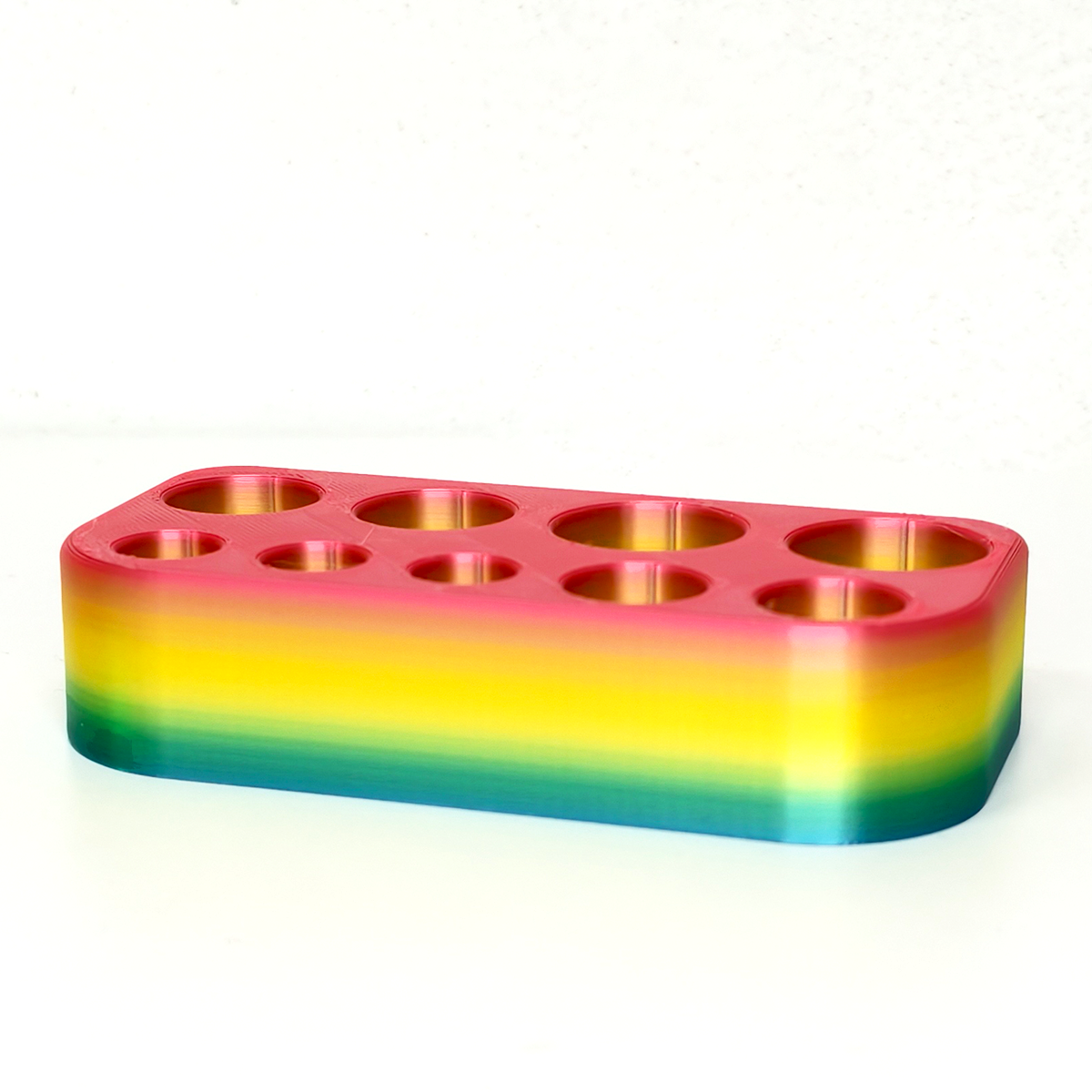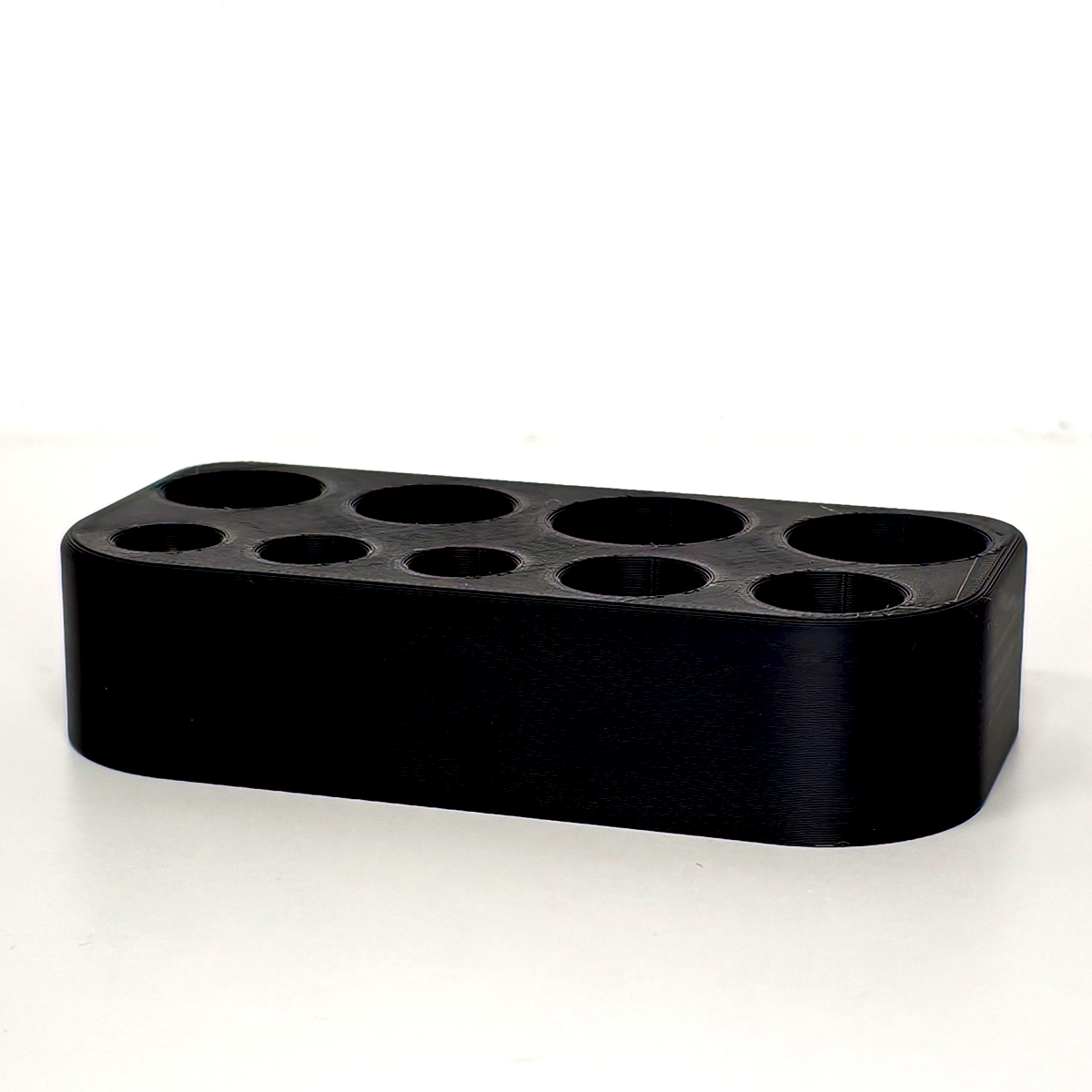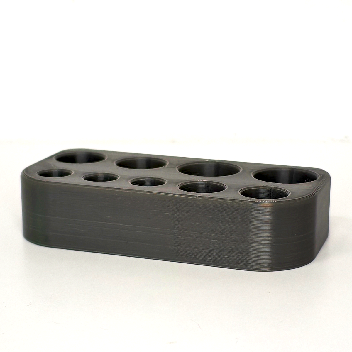 Statyw został zaprojektowany tak, aby pomieścić ampułki o różnych pojemnościach — od 1 ml aż do 20 ml. Dzięki odpowiednio dobranym średnicom otworów: